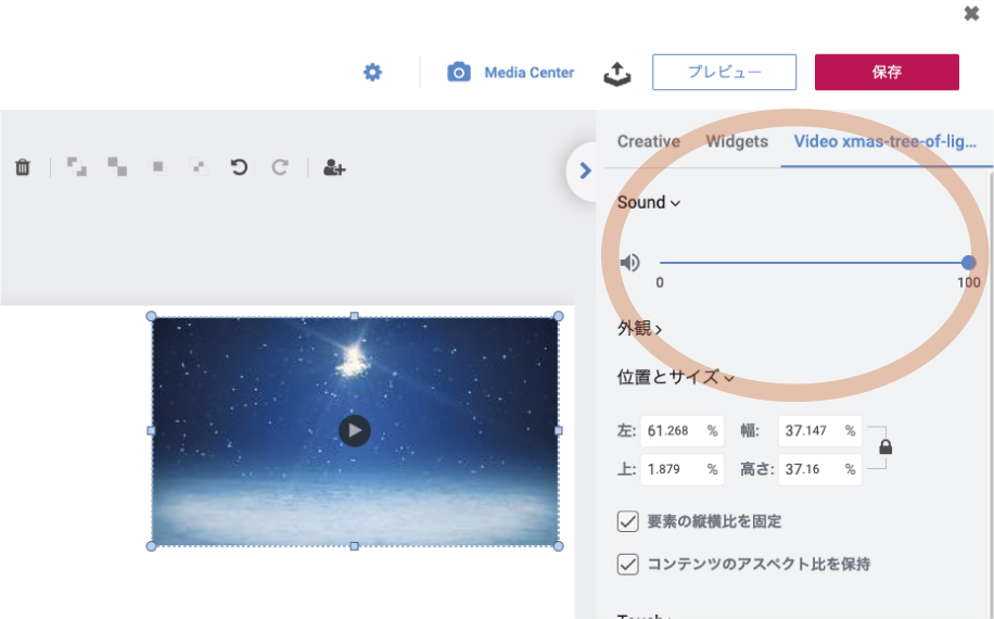 音量を調整する[動画widgets ]を 選択 し、 右側パネル[sound] 項目中のスライドバーで音量を調節する。