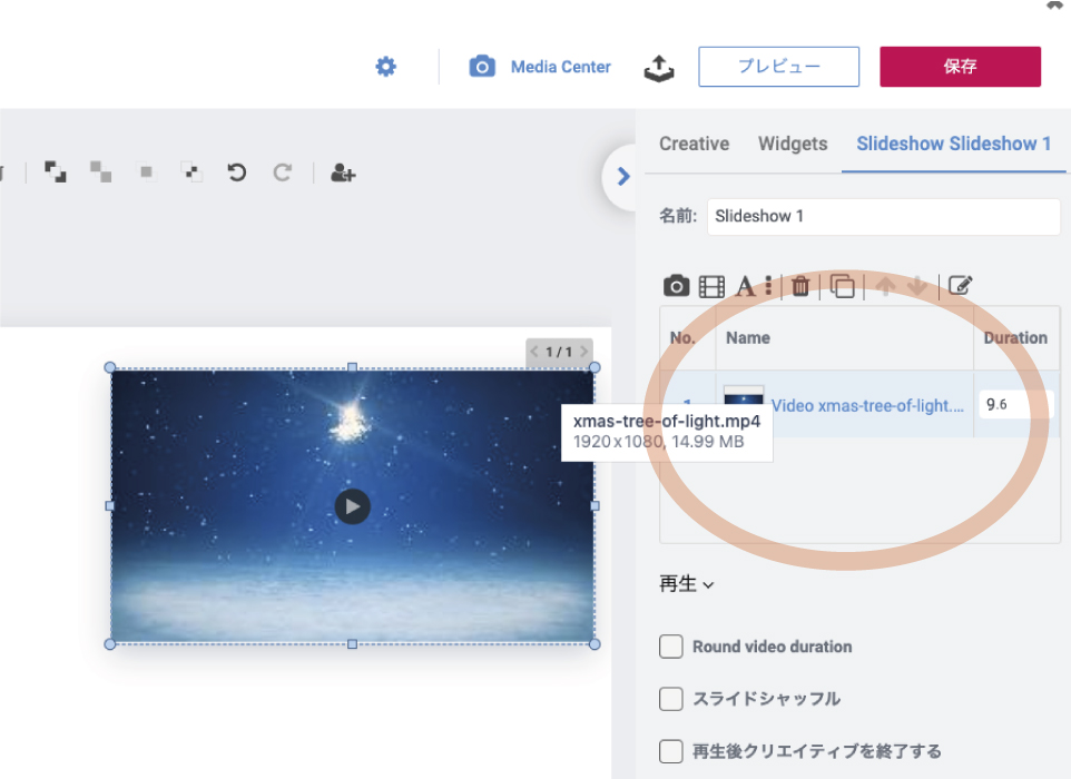音量を調整する動画を含む[スライドショーwidgets ]を 選択 し、右側パネルに表示されている目的の動画の名前をダブルクリックする。